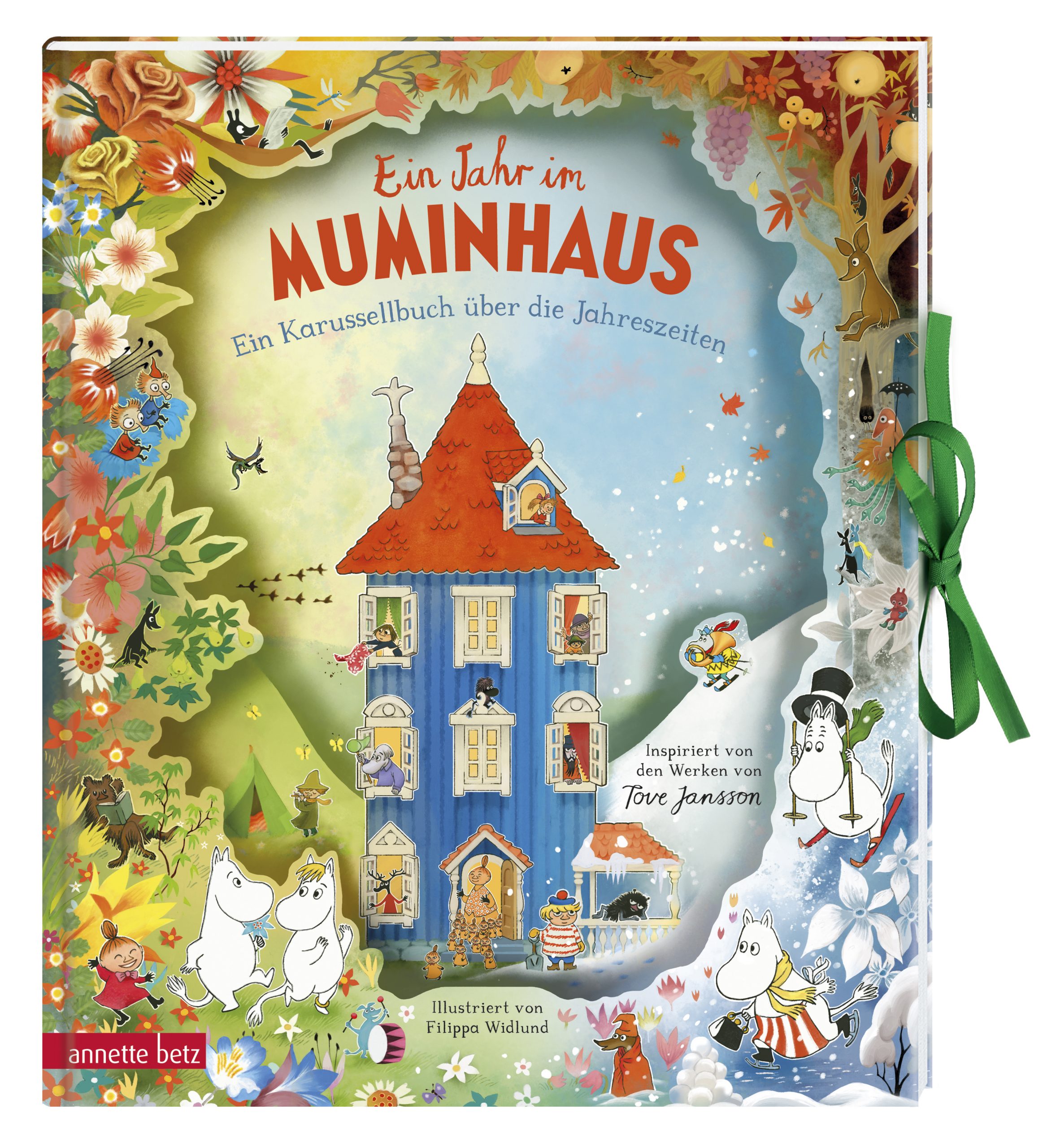 Zunächst wird es Frühling und Mümmla und ihr 34 Kinder kommen zu Besuch. Mumin wartet auf den Schlüpferich. Im Laufe des Frühlings wird aus den Pflanzen ein Dschungel, den wir vorne sehen, weiter hinten im Haus wird vorgelesen. Es wird Mittsommer und alle feiern und sitzen essend um den großen Tisch. Dann wird es Herbst und der Dampfkochtopf steht auf dem Herd, um Marmelade einzukochen. Die warmen Erdfarben werden kühl und der Winter kommt. Auf dem letzten Bild sehen wir einen Tannenbaum.