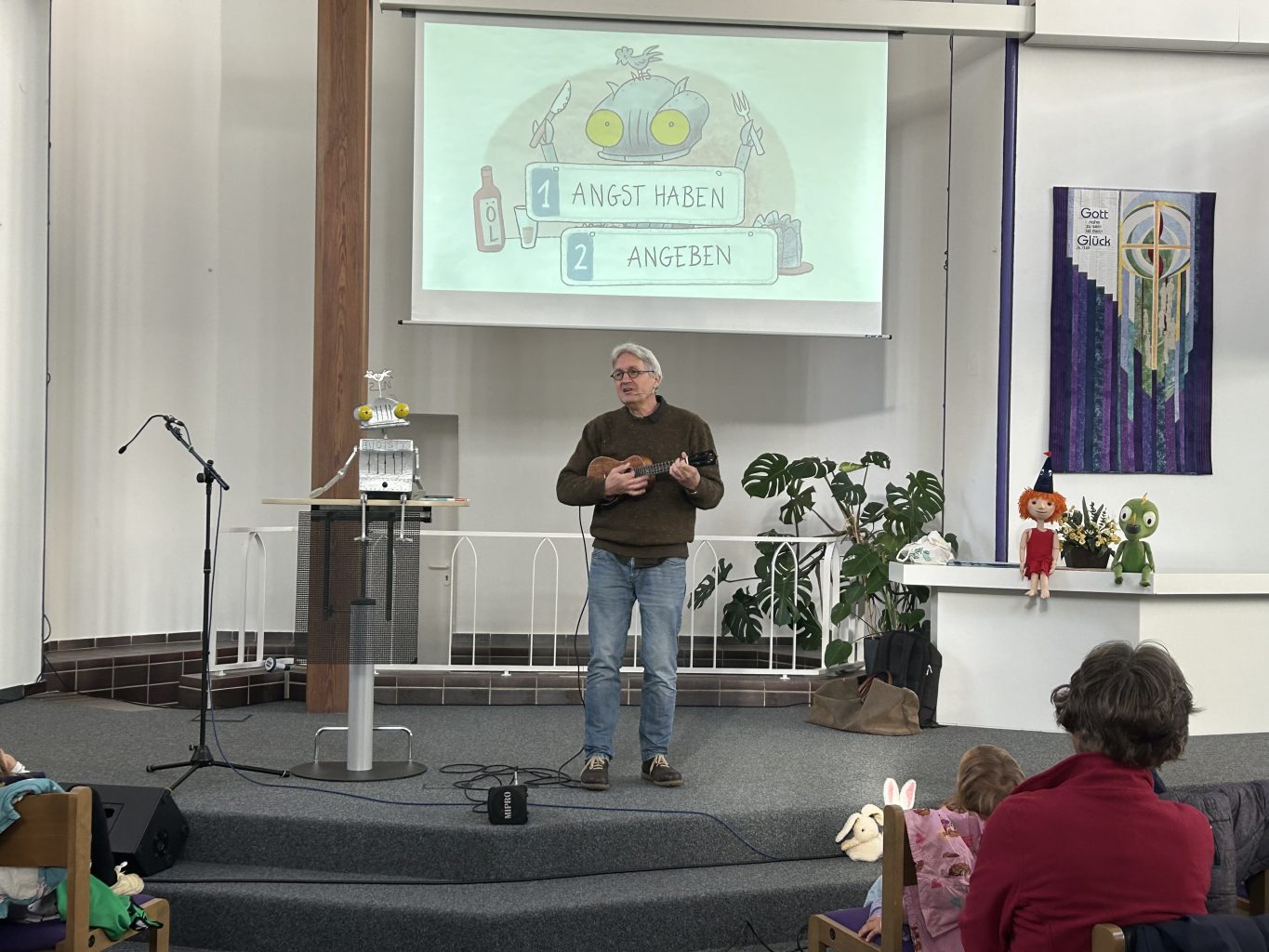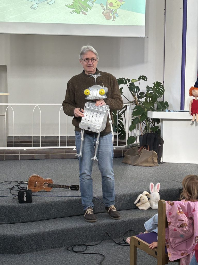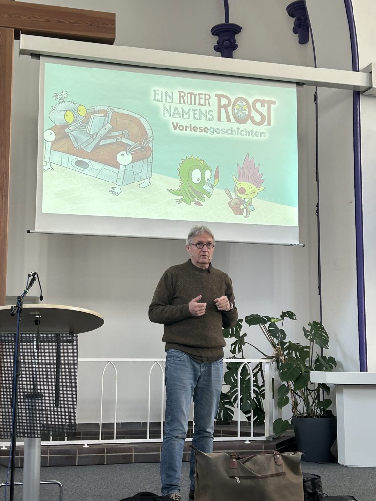 Die knapp 1 Stunde gehende Veranstaltung in der Evangelisch-Freikirchlichen Gemeinde Essen-West bot eine Menge für die Kinder. Jörg Hilbert las nicht nur die Geschichte vor, sondern er zeigte den Kindern mit Hilfe von Projektionen auch, wie er den Ritter Rost malt oder wie er neue Figuren für das Ritter Rost-Universum entwickelt. Mit seinem besonderen Blick entdeckt Jörg Hilbert nämlich immer wieder in alltäglichen Gegenständen neue, komische Lebewesen. Und er hat auch auf seiner Ukulele ein neues Lied vom Ritter Rost gesungen.