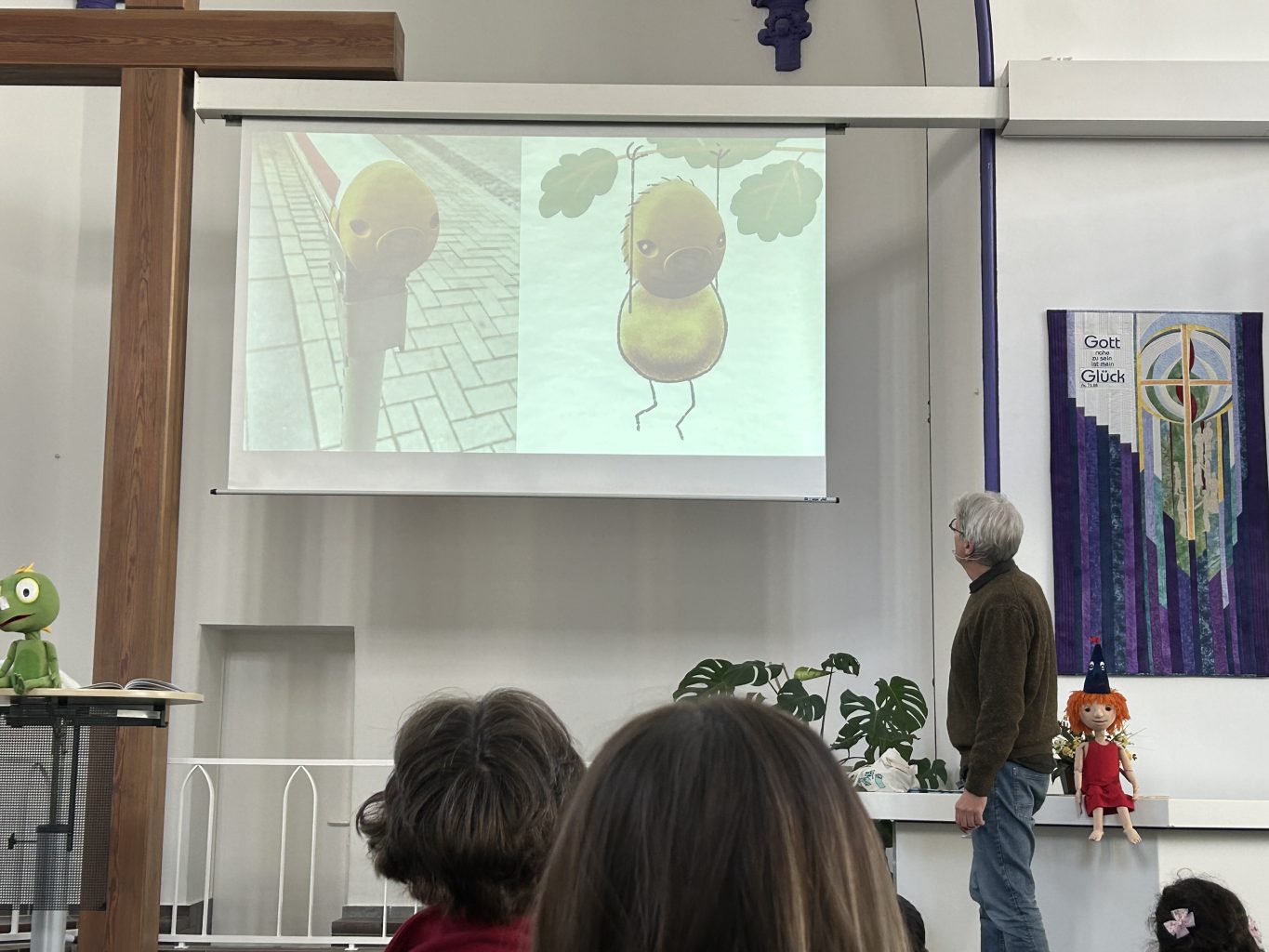 Diese Geschichte konnten am Freitag, 26.9.2025, 70 Kindergartenkinder im Rahmen einer Lesung des Essener Kinderbuchautoren und Illustratoren Jörg Hilbert hören.